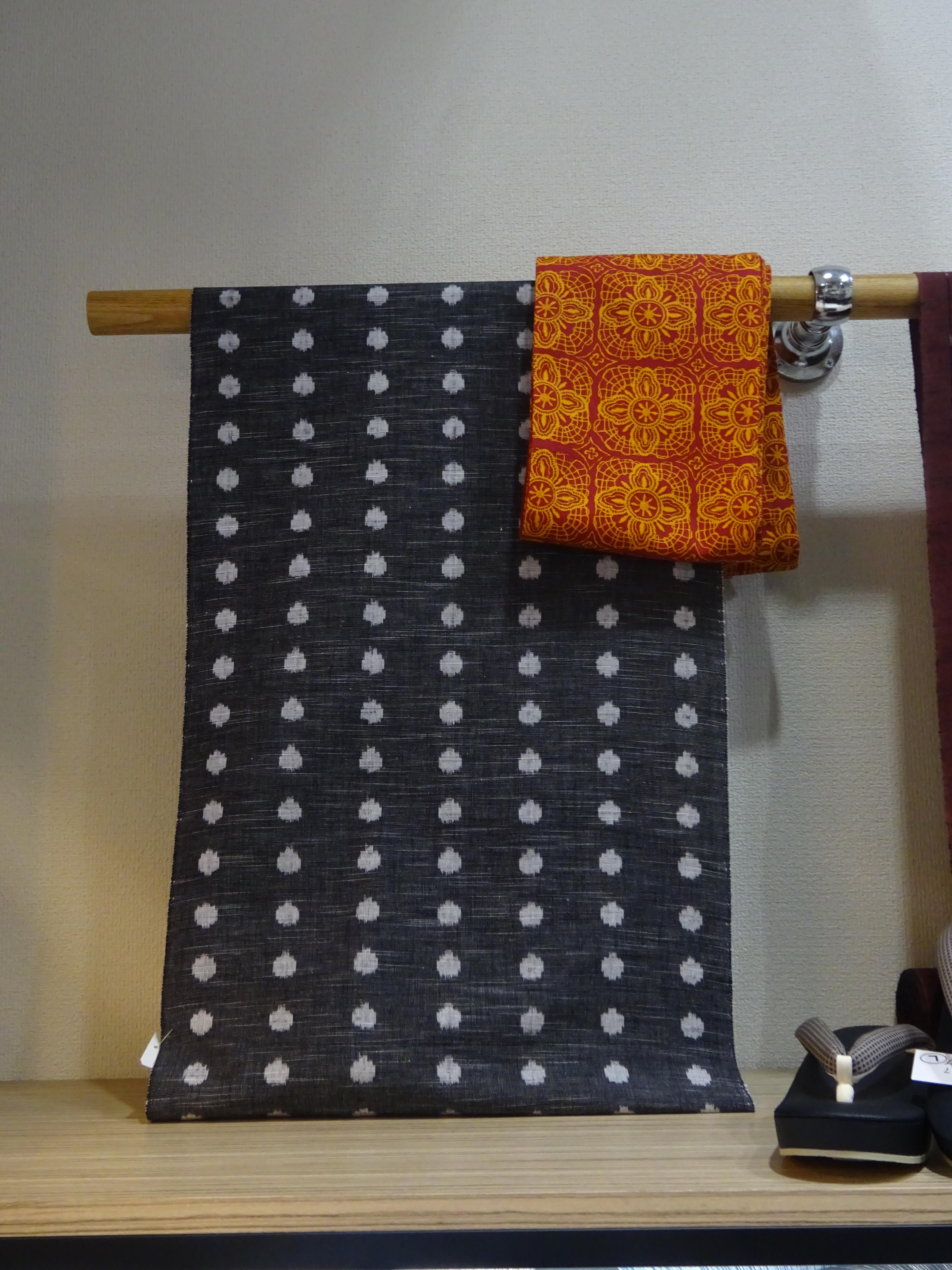 水玉の久留米絣にあたたかみのある朱色の帯び合わせ