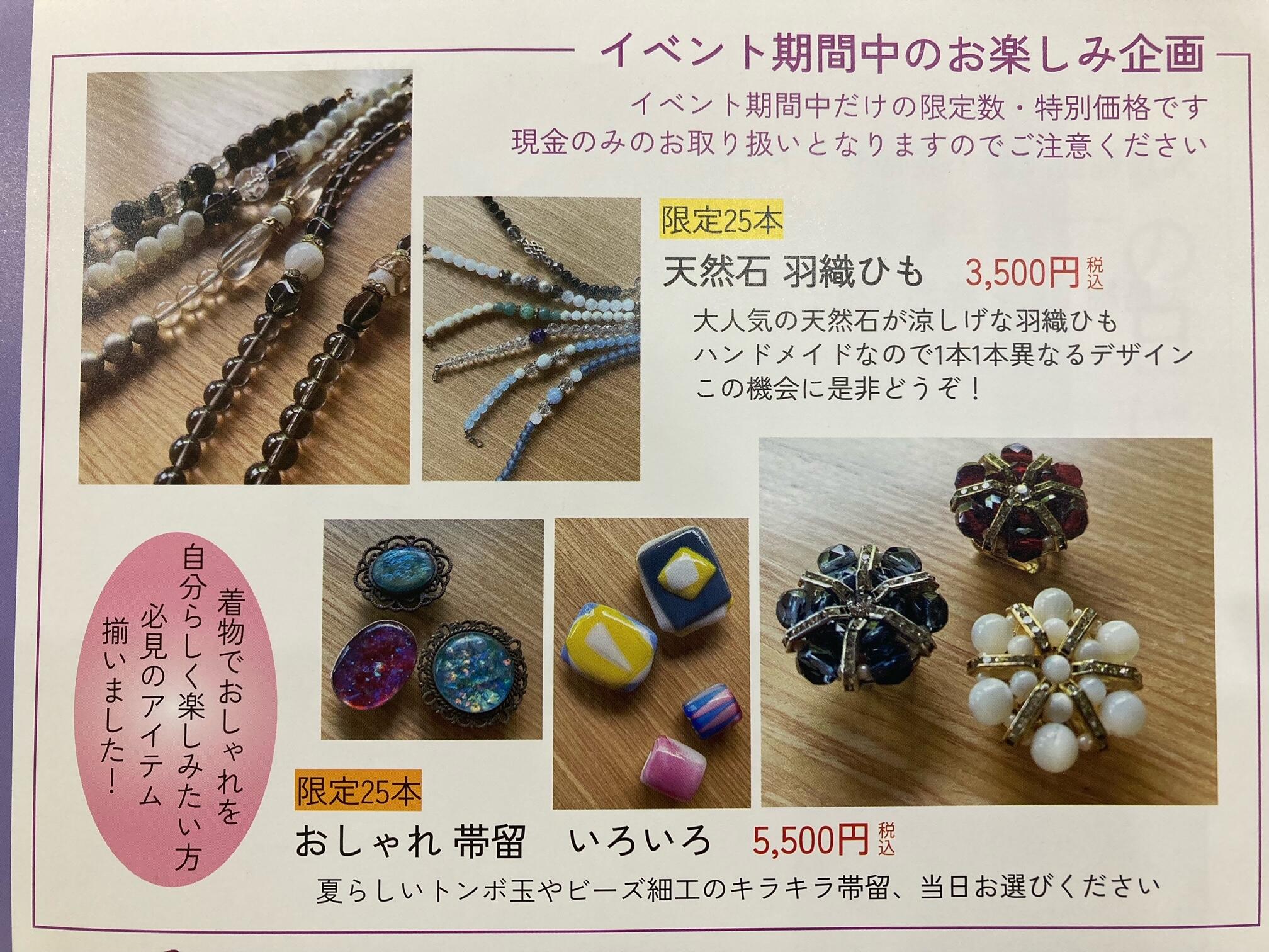 お楽しみ企画として天然石羽織紐と帯留もご用意いたしました